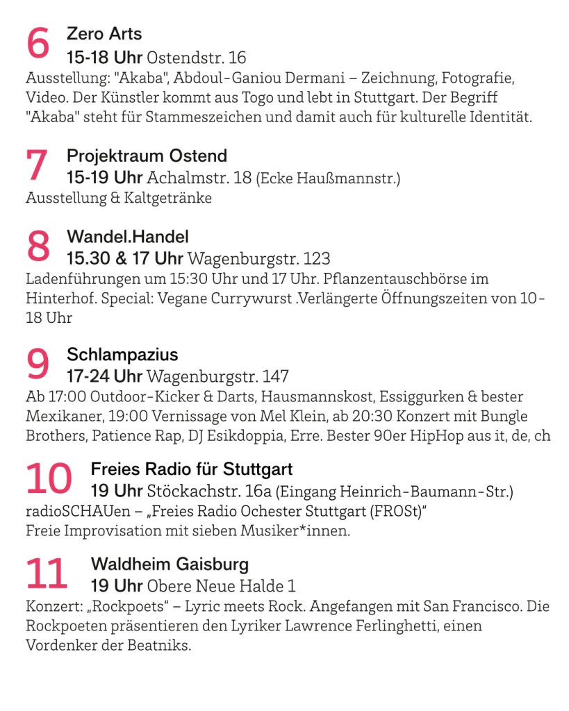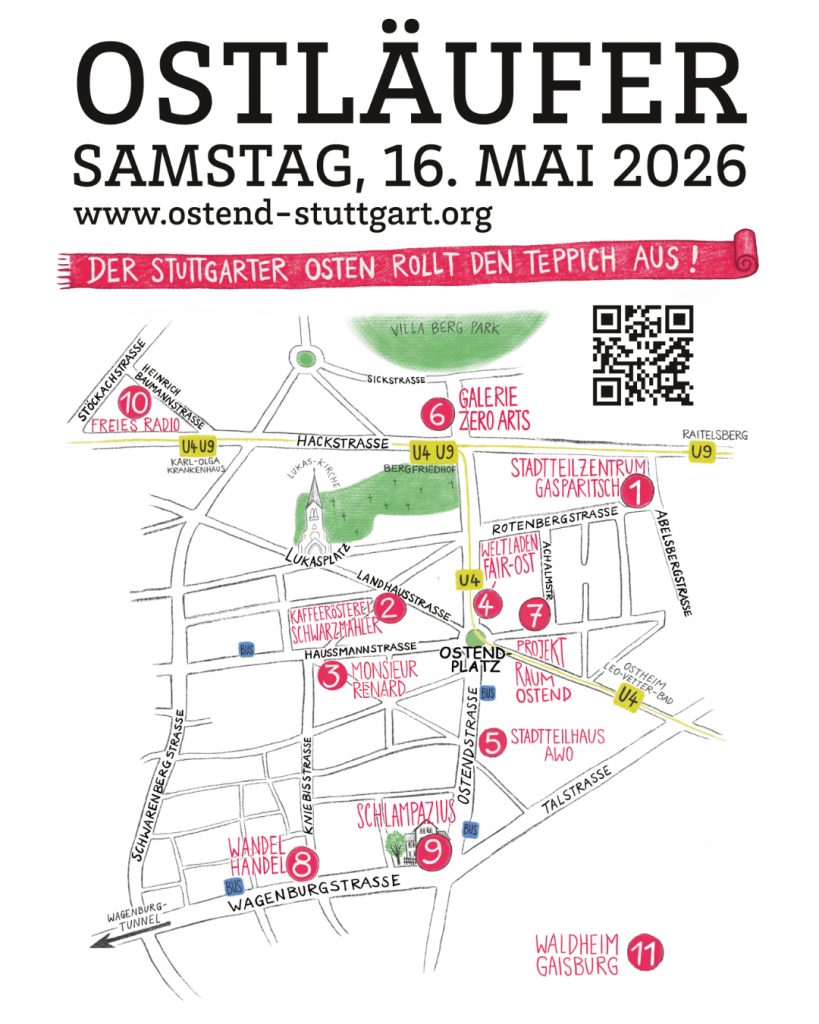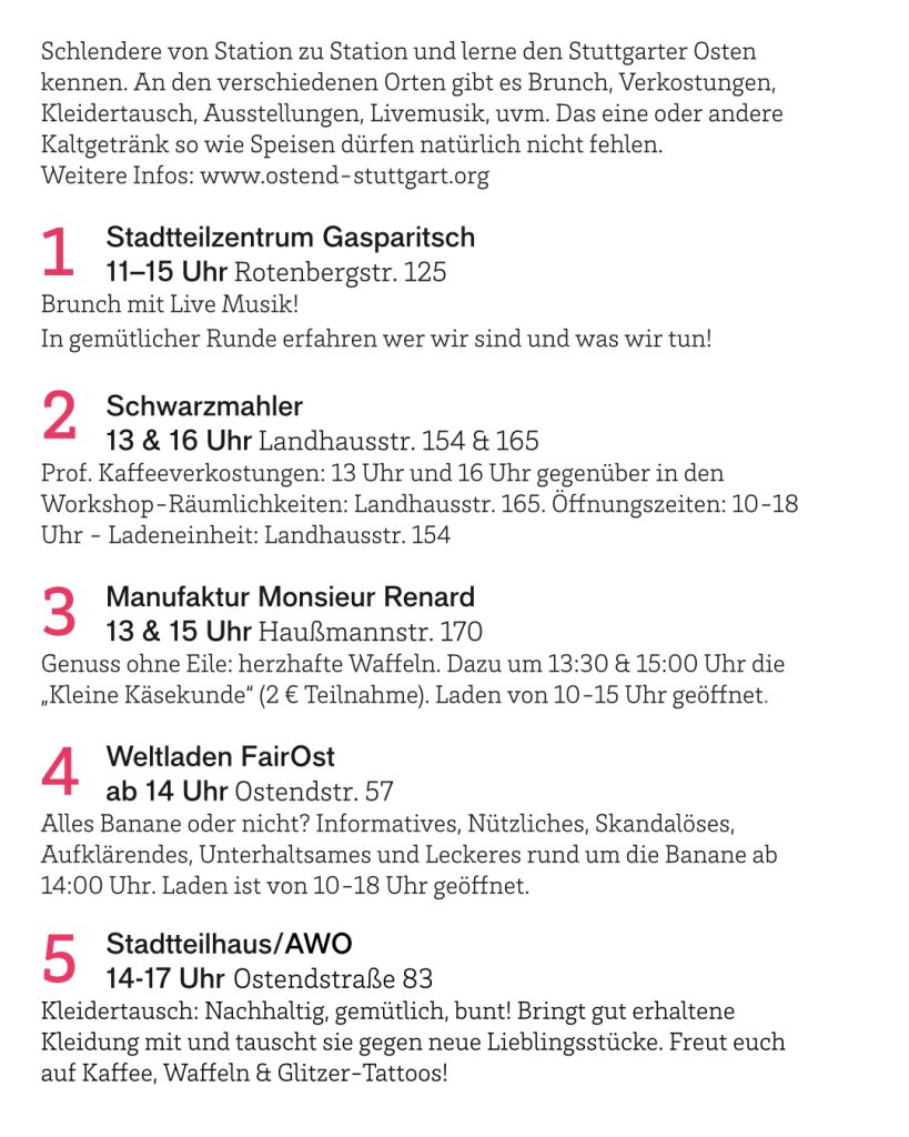 Schlendere von Station zu Station und lerne den Stuttgarter Osten kennen. An den verschiedenen Orten gibt es Ausstellungen, Lokalgeschichte, Livemusik, Verkostungen, Brunch, Kinderprogramm uvm. Das ein oder andere Kaltgetränk so wie Speisen dürfen natürlich nicht fehlen.